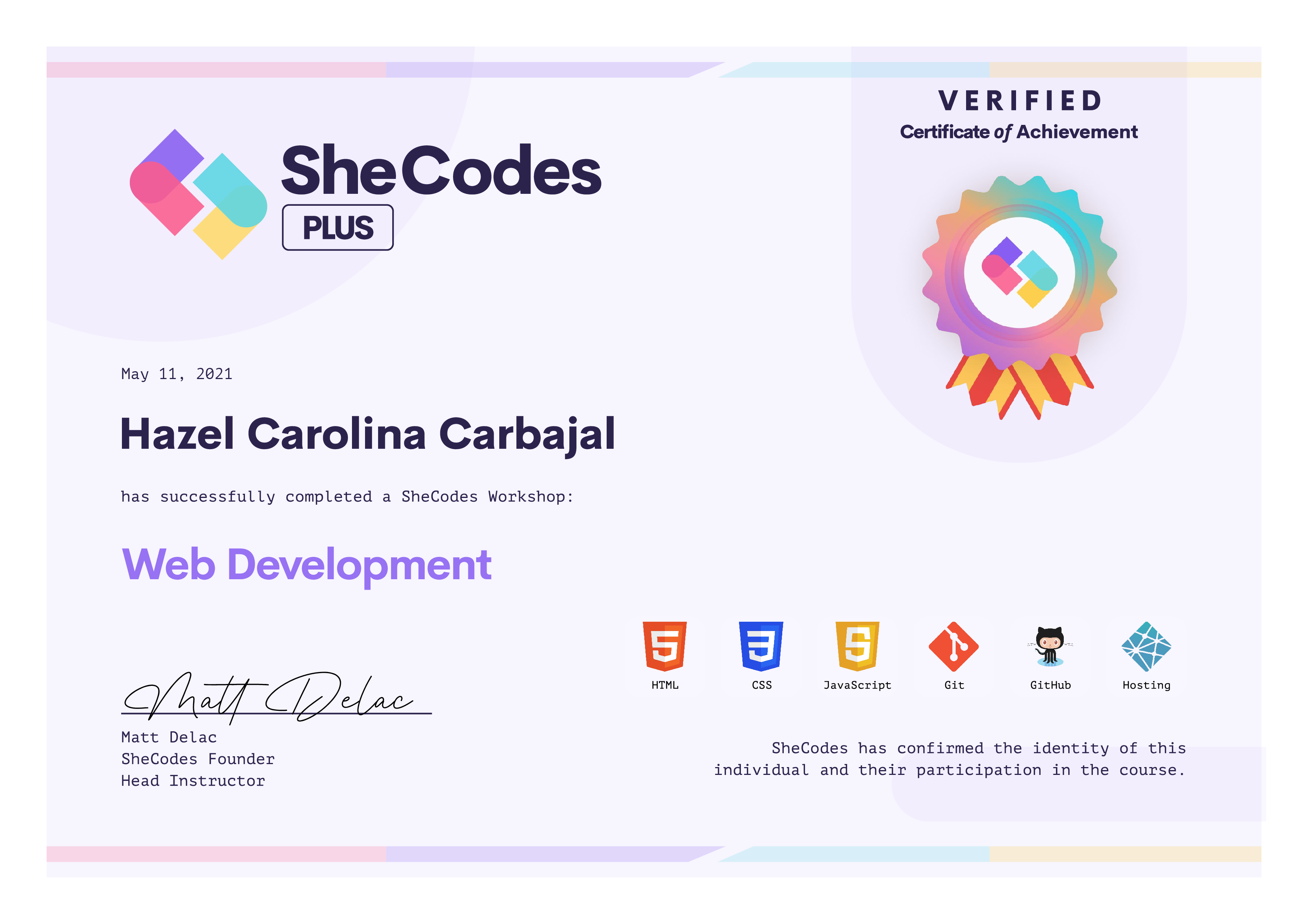 Hazel successfully graduated from at least one SheCodes Coding Workshop and is featured in the SheCodes Hall of Fame
